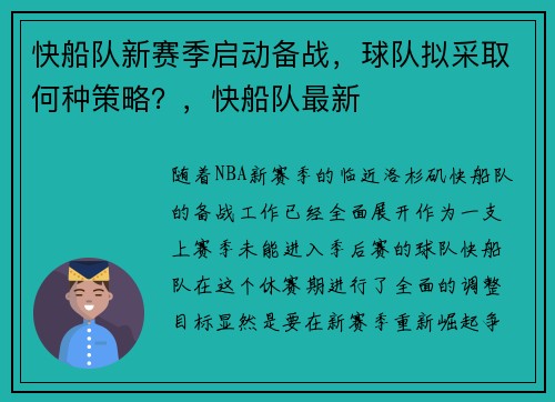 快船队新赛季启动备战,球队拟采取何种策略?,快船队最新