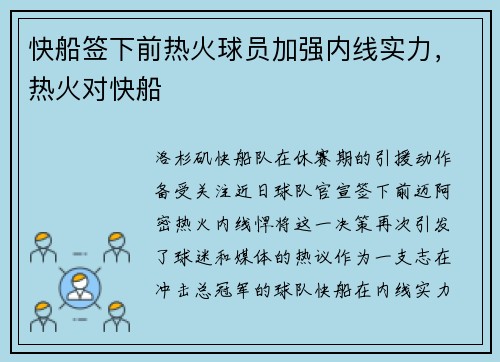 洛杉矶快船队在休赛期的引援动作备受关注。近日,球队官宣签下前迈阿密热火内线悍将,这一决策再次引发了球迷和媒体的热议。作为一支志在冲击总冠军的球队,快船在内线实力上的补强,无疑为他们的新赛季注入了更多可能性。 这位前热火球员在职业生涯中一直以...