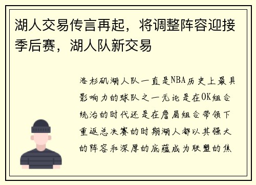 湖人交易传言再起,将调整阵容迎接季后赛,湖人队新交易