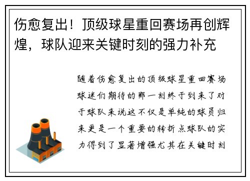 伤愈复出!顶级球星重回赛场再创辉煌,球队迎来关键时刻的强力补充