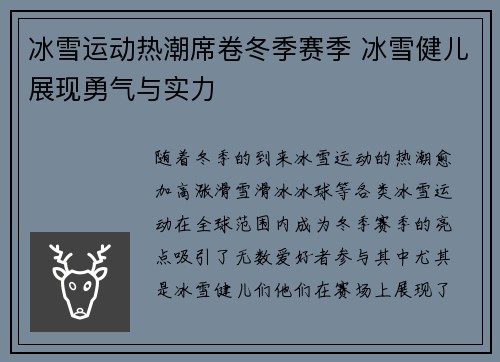 随着冬季的到来,冰雪运动的热潮愈加高涨。滑雪、滑冰、冰球等各类冰雪运动在全球范围内成为冬季赛季的亮点,吸引了无数爱好者参与其中。尤其是冰雪健儿们,他们在赛场上展现了超凡的勇气与实力,打破了一个又一个的记录,不仅为自己争得荣誉,也为国家争光。...