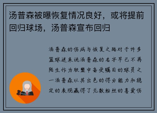 汤普森被曝恢复情况良好,或将提前回归球场,汤普森宣布回归