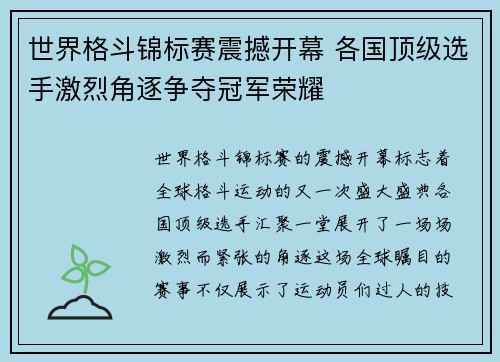 世界格斗锦标赛震撼开幕 各国顶级选手激烈角逐争夺冠军荣耀
