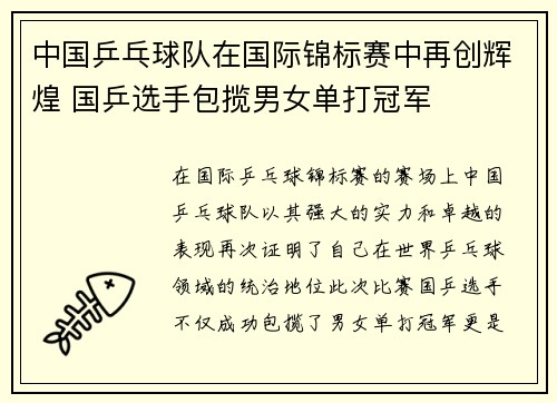 中国乒乓球队在国际锦标赛中再创辉煌 国乒选手包揽男女单打冠军